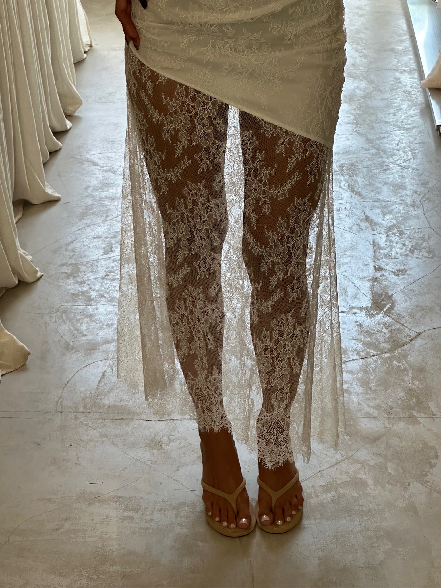 Sheer lace maxi skirt in beige with a spandex lining for comfort. Lightweight, elegant, and gentle on the skin — designed to style effortlessly with matching tops or swimwear for a refined feminine look.